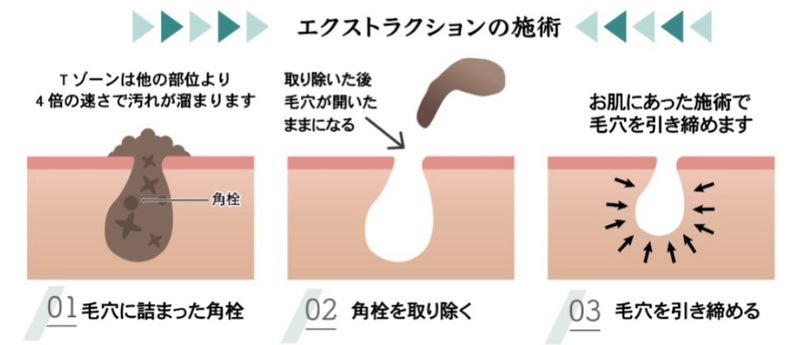 市販の毛穴ケア商品(洗顔やパック、スクラブなど)や、毛穴洗浄・毛穴吸引など、いろいろな技術がありますが、実は、毛穴の奥底の詰まりを除去するのは難しく、またすぐ毛穴に汚れがたまり、毛穴が開いてしまいます。当店のエクストラクションは、毛穴の奥からしっかりお掃除するため、毛穴がだんだん目立ちにくく、自己流の詰まり取りで、繰り返しみられる黒ずみ角栓や、ザラっとした肌、乾燥テカリ悩みにアプローチしていくことで、美しい毛穴やお肌へ整っていきます。