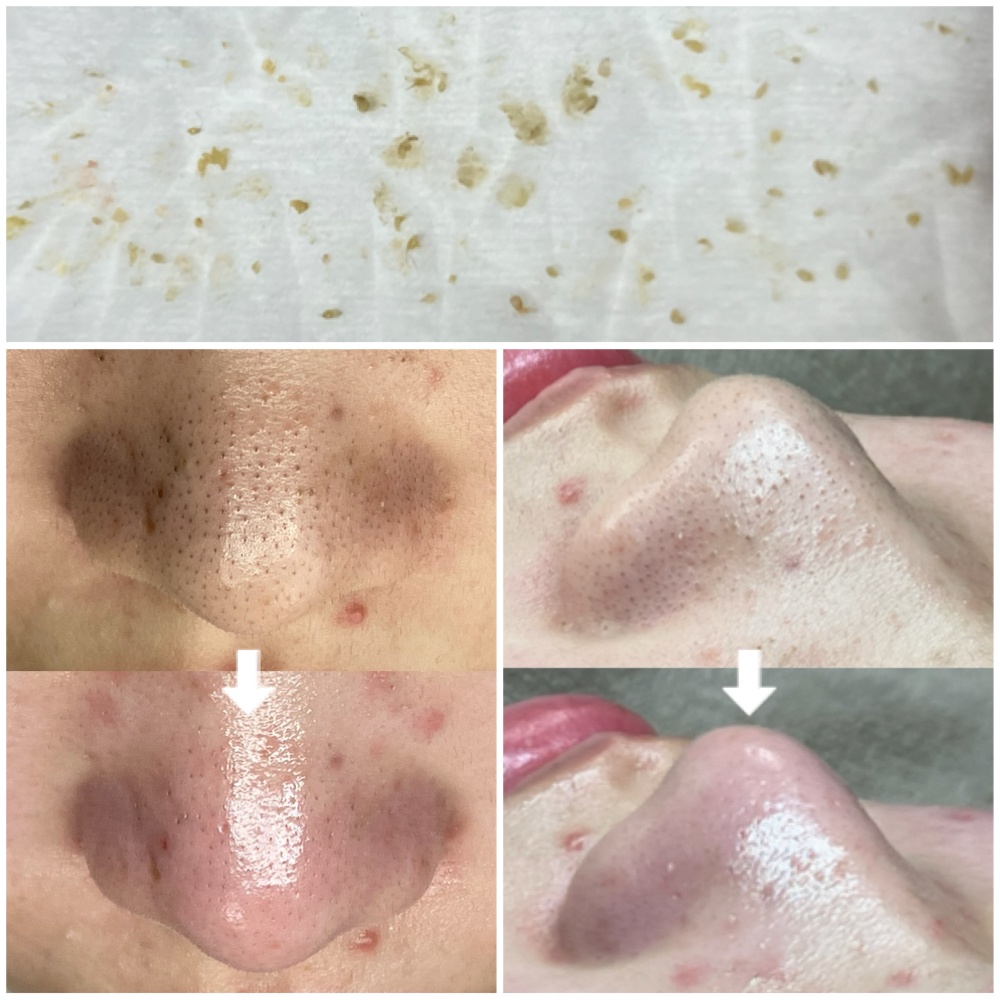 毛穴の詰まりは、触るとザラつきを感じる白角栓だけでなく、長い間角栓を放置すると表面が黒く変化していちご鼻に見える黒角栓。角栓に絡まり抜けなくなった産毛など、さまざまな毛穴詰まりがあります。顔脱毛に通っても、なかなか抜けきれない毛、、、その場合は、角栓に絡まった黒い産毛である事が多く、それが取れる毛穴ケアは「 エクストラクションのみ 」と言われています。
